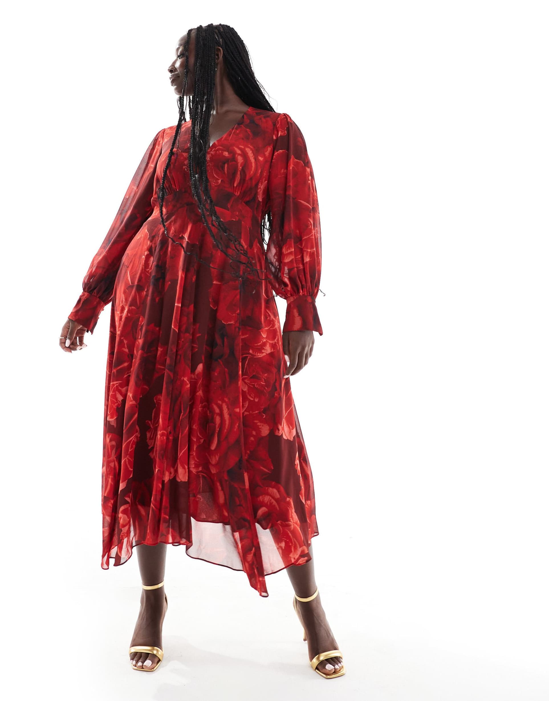 EVER NEW CURVE LONG SLEEVE MAXI DRESS IN RED ROSE FLORAL