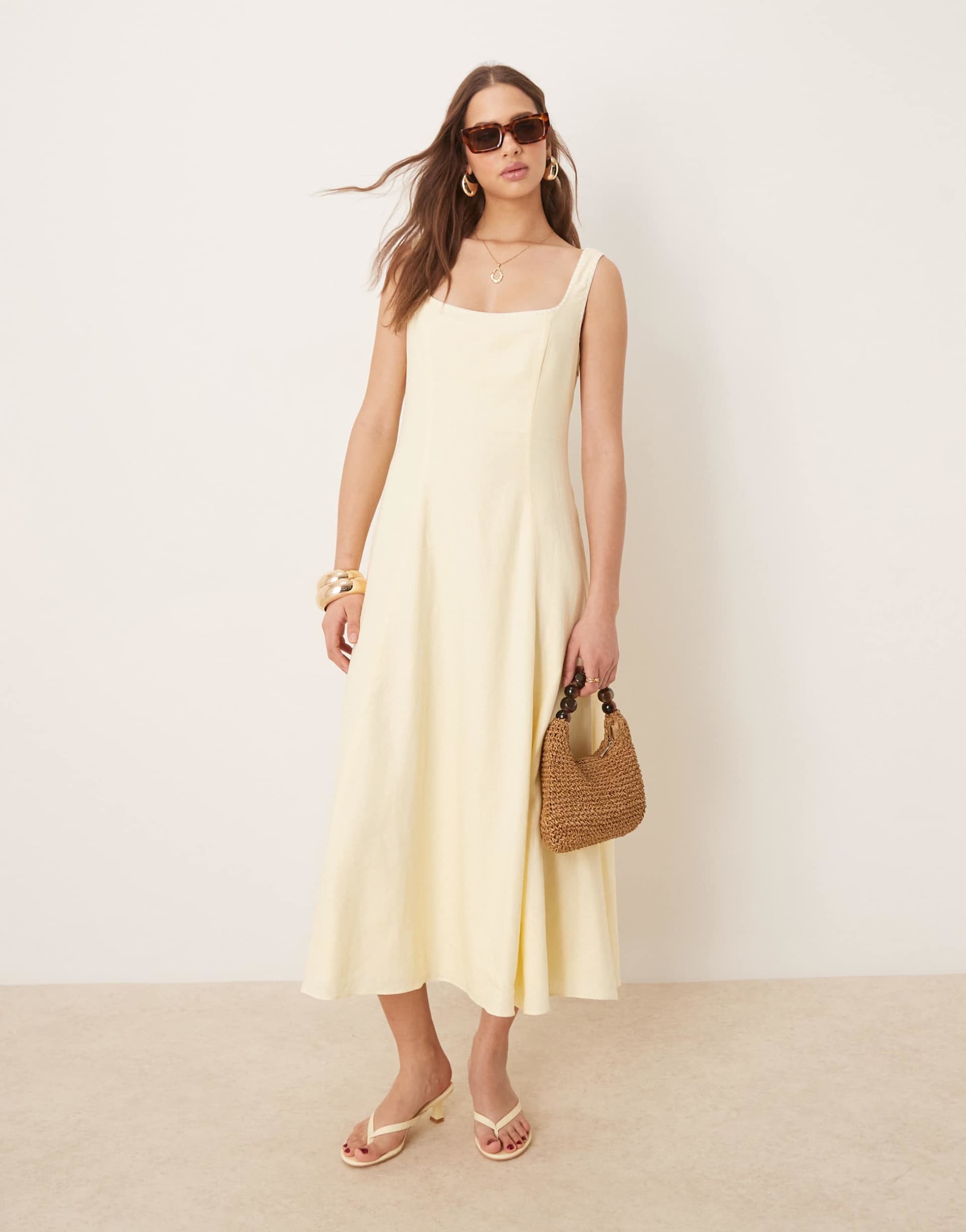 EVER NEW LINEN BLEND CONTRAST STITCH MIDAXI DRESS IN LEMON