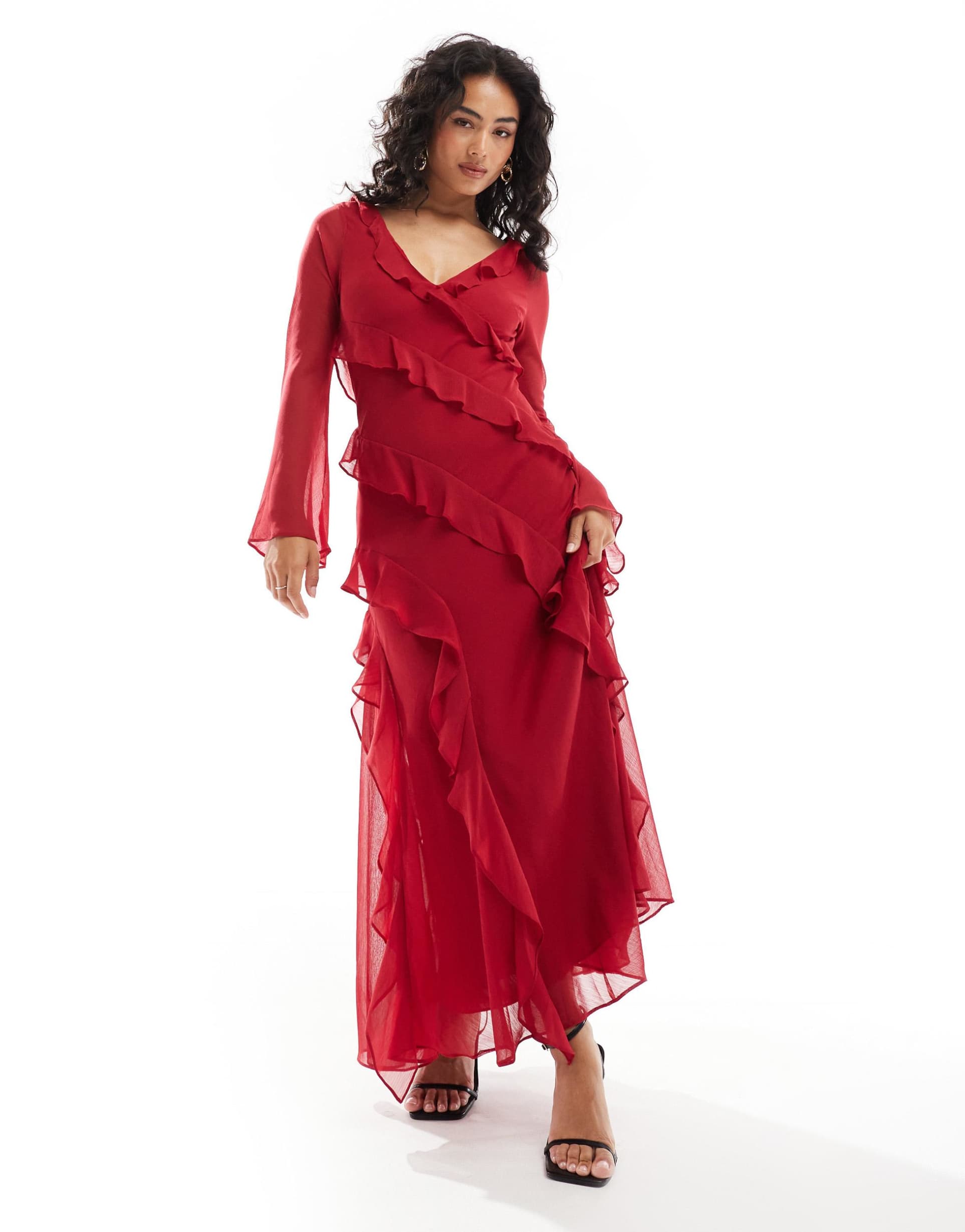 Soft chiffon layers and flared sleeves create a romantic silhouette in this matte red midi dress. The V-neckline and flowing ruffle details enhance its elegant appeal, while the tie-back closure adds a delicate finishing touch. Crafted from lightweight polyester chiffon, this regular fit midaxi dress is perfect for spring and summer occasions such as brunch, date nights, or cocktail events. Its asymmetric hem and sheer panels provide movement and grace, combining comfort with sophisticated style for versatile wear.