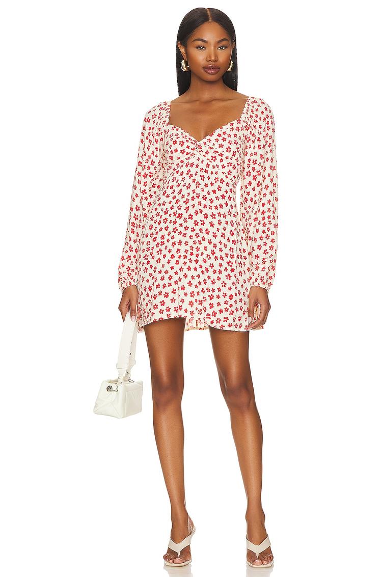 Soft crepe fabric and a loose shift silhouette bring easy elegance to this mini dress, featuring a romantic sweetheart neckline with a twist detail at the bust. The long blouson sleeves with elastic cuffs add a breezy, bohemian vibe, while the hidden side zipper ensures a smooth fit. Covered back and all-over floral print in matte white and red create a fresh and feminine look. Perfect for brunch, date nights, or cocktail events in spring through autumn, this dress blends casual chic style with comfortable wearability.