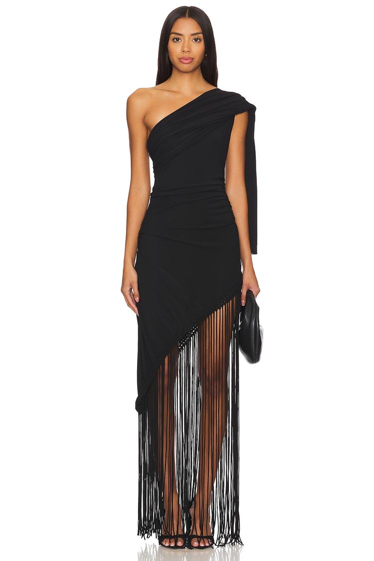 Soft jersey fabric and a sleek sheath silhouette define this matte black maxi dress with a striking asymmetric neckline. The wide strap and draping detail on one shoulder lend a modern, elegant vibe, while ruched sides enhance the fitted silhouette. The asymmetric fringed hem adds movement and flair, making it perfect for cocktail parties, night outs, or romantic date nights. With a concealed side zipper and side slit for ease, this dress blends sophistication with subtle edge and versatility for multiple occasions.