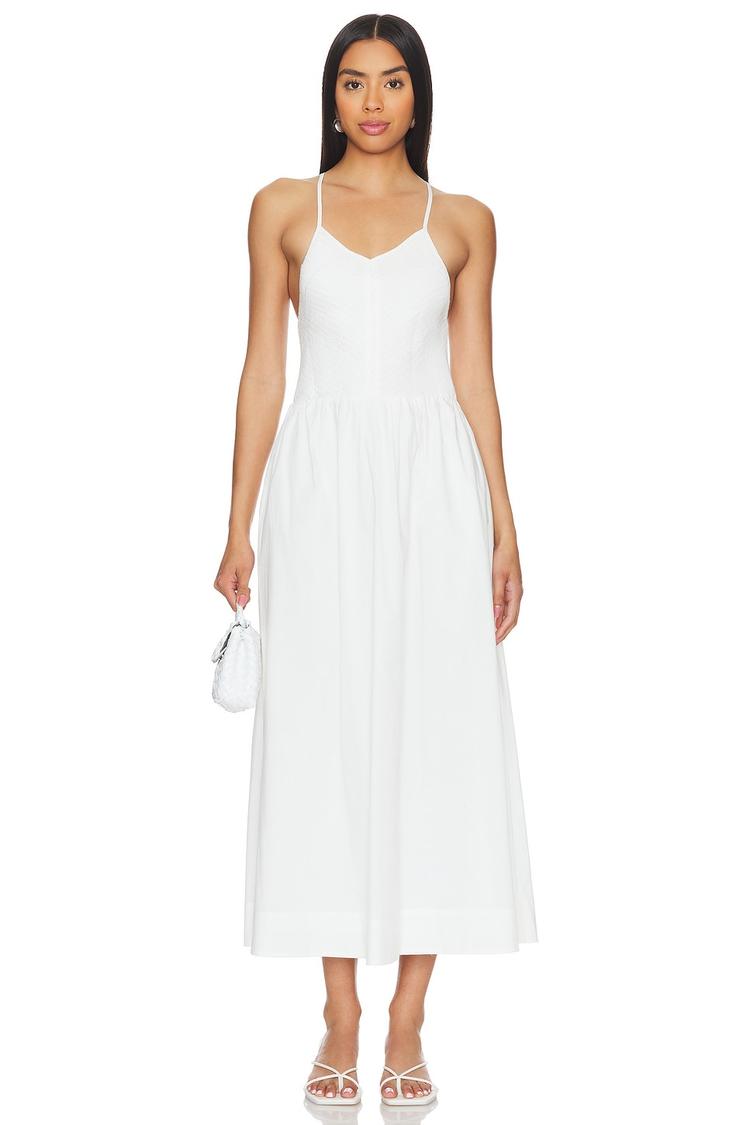 Lightweight poplin fabric and a smocked bodice create an effortlessly chic silhouette in this white A-Line midi dress. The V-neckline and spaghetti straps lead to a delicate tie-back closure, while side seam pockets add practical comfort. Fully lined for a smooth feel, this breathable cotton and rayon blend is ideal for warm spring and summer days. Perfect for casual outings, beach vacations, or brunch dates, its clean hemline and flowing fit make it a versatile wardrobe staple that blends bohemian charm with casual sophistication.