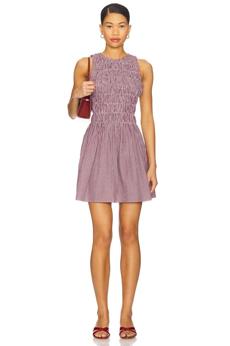 Soft cotton poplin with a smocked bodice shapes this mini shift dress in a dusty rose hue. The sleeveless design and round neckline offer a clean, minimal silhouette, while the button loop closure at the covered back adds subtle detail. Its slim fit and lightweight fabric make it ideal for spring and summer outings, from casual brunches to relaxed date nights. Effortless and versatile, this dress pairs beautifully with sandals or sneakers for easy everyday chic.
