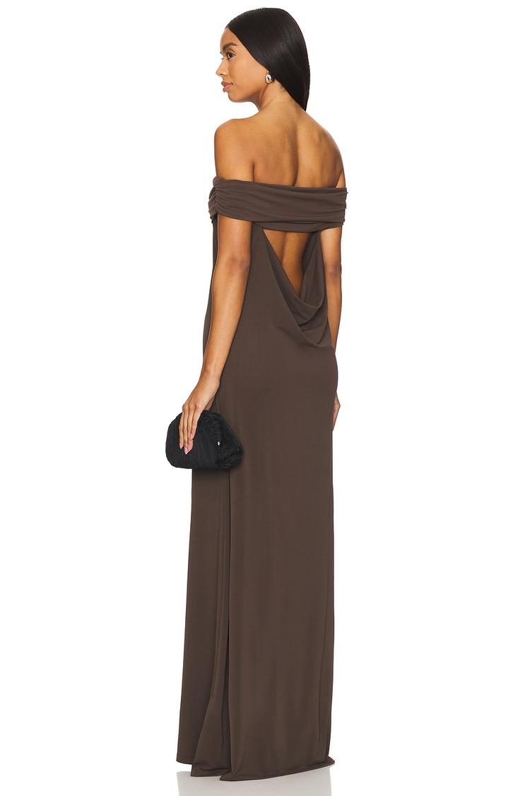 Soft, lightweight crepe fabric shapes this matte brown column maxi dress into a sleek and elegant silhouette. The straight off-shoulder neckline beautifully frames the shoulders while the dramatic draped back adds a modern, minimalist flair. Designed with a slim fit and a clean hemline, this pull-on dress offers effortless sophistication ideal for date nights, cocktail parties, or evening outings. Crafted from a polyester-elastane blend, it ensures comfort and subtle stretch, making it a versatile choice for spring and summer occasions.