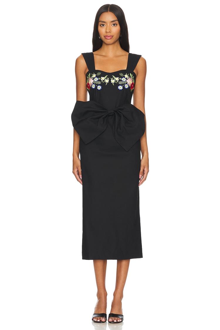 Embody timeless elegance with this matte black sheath dress crafted from crisp cotton poplin. The fitted midi silhouette features a sophisticated square neckline and wide straps, adorned with vibrant floral embroidery across the bodice for a fresh, colorful accent. A detachable bow at the back adds a chic, customizable detail alongside a back vent for ease of movement. Ideal for cocktail parties, semi-formal events, or romantic date nights, this dress blends classic style with modern sophistication and breathable fabric comfort.