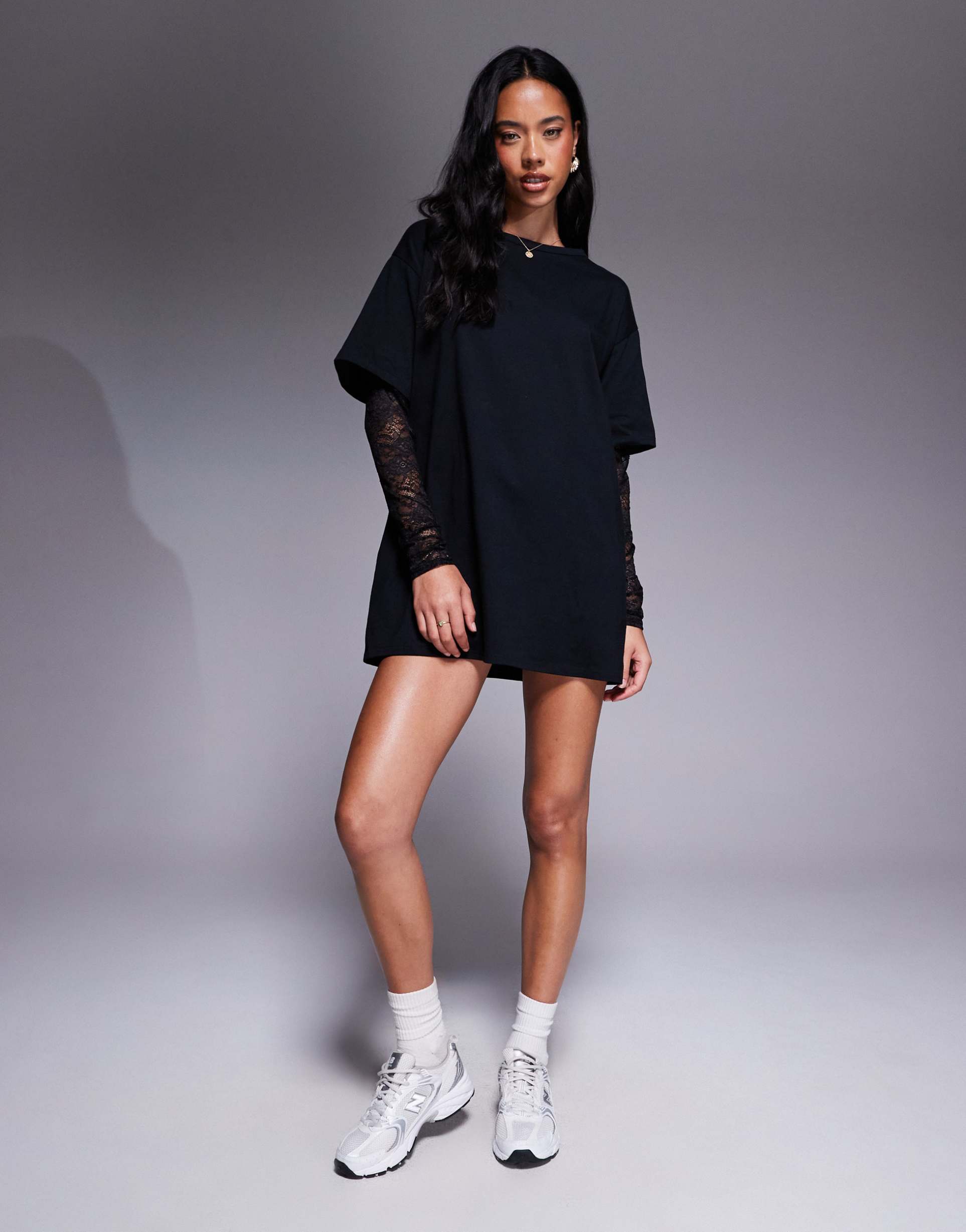 FASHIONKILLA COTTON LACE SLEEVES MINI T-SHIRT DRESS IN BLACK
