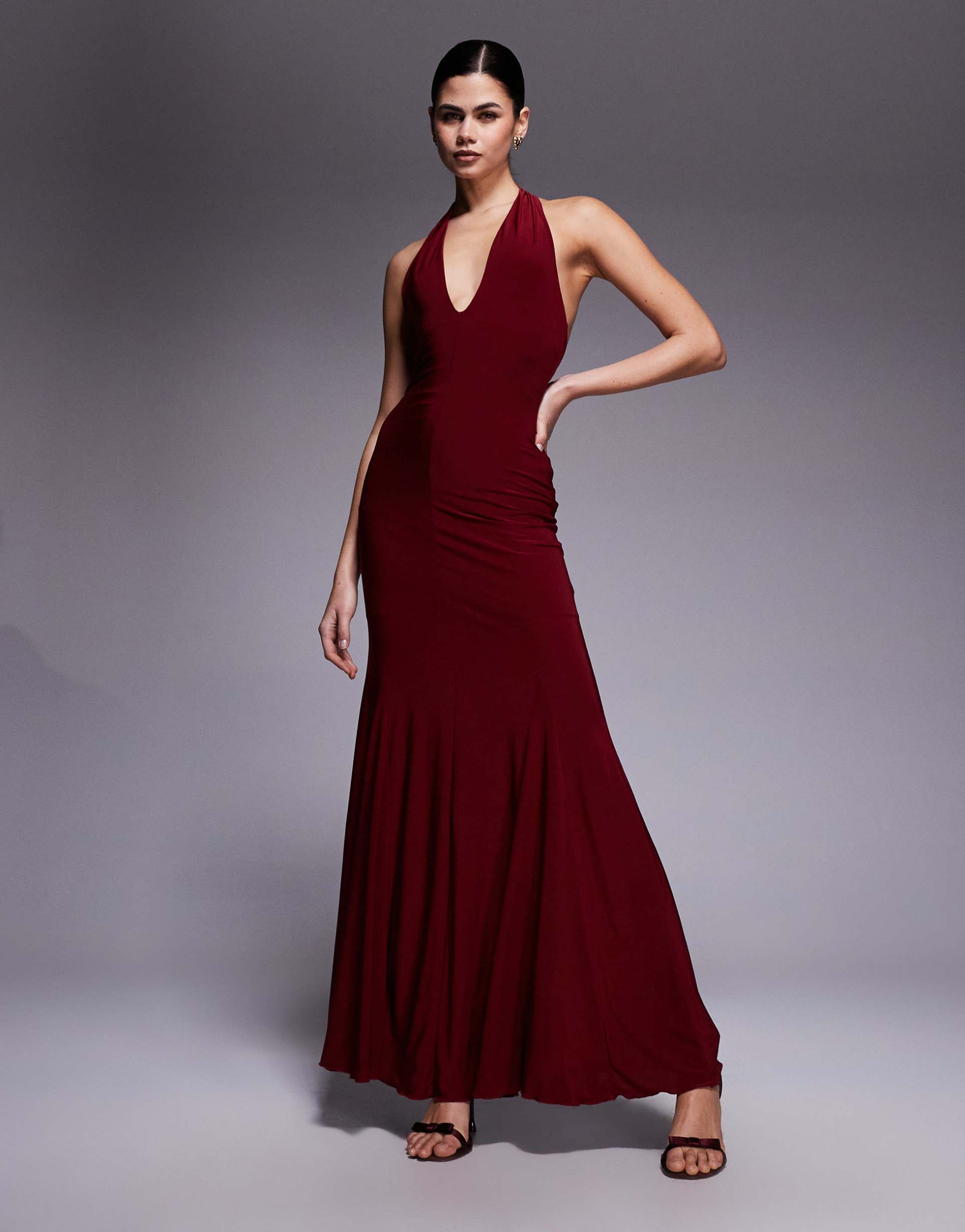 FASHIONKILLA DOUBLE SCULPTED SLINKY PLUNGE HALTERNECK GODET HEM MAXI DRESS IN BURGUNDY