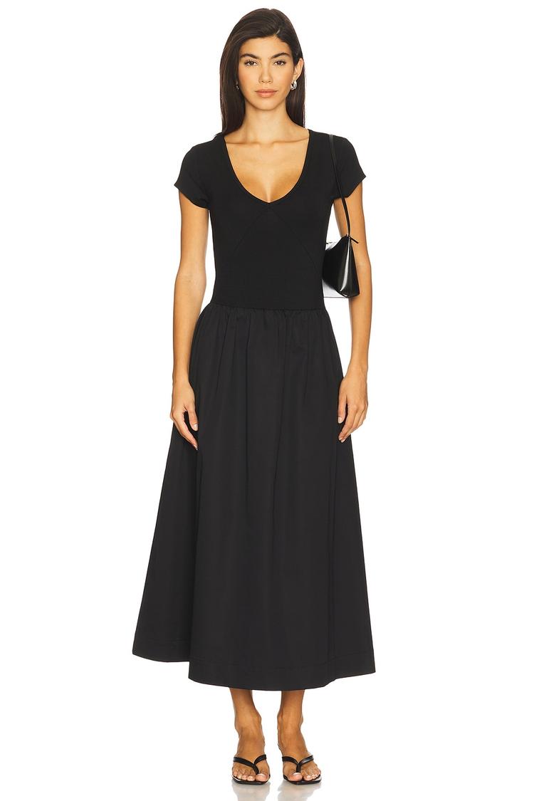 A timeless black midi dress blending a fitted modal jersey bodice with a flowing cotton poplin skirt. The flattering V-neckline and short sleeves enhance its classic fit-and-flare silhouette, while side seam pockets add practical charm. Its clean hemline and minimalist style make it suitable for casual outings, brunch dates, and workwear, offering versatile elegance across seasons.