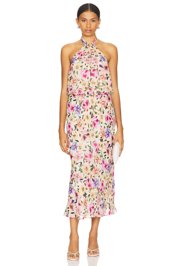 Soft chiffon in a cream base adorned with pink, purple, and blue florals creates a romantic and sophisticated look. The relaxed shift silhouette features a halter neck with tie-back closure and a ruffled hem that adds a delicate touch. Fully lined for comfort, this midi-length dress is perfect for spring and summer occasions like brunch, date nights, or cocktail events. The elastic waistband ensures easy pull-on styling, combining elegance with effortless wearability.