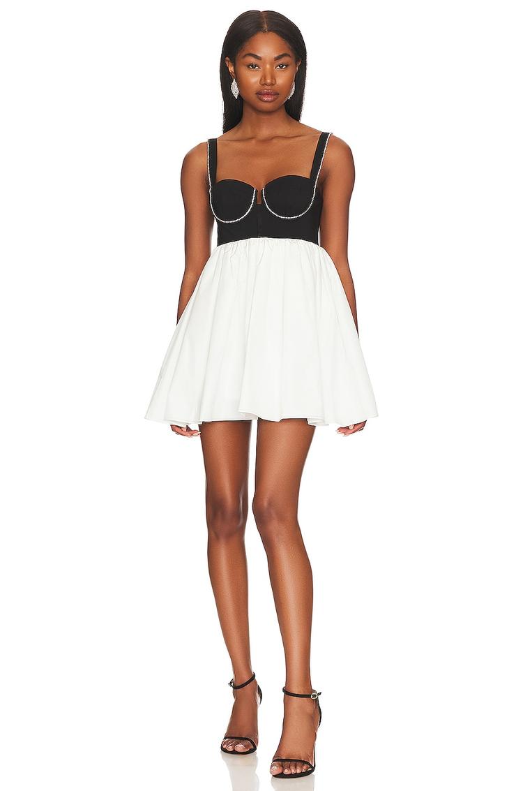A striking babydoll mini dress with a matte black fitted bodice and contrasting matte white skirt offers a playful yet chic silhouette. The sweetheart neckline and sleeveless design with adjustable straps enhance comfort and style. Crystal embellishments along the neckline add a touch of sparkle and sophistication. Crafted from a cotton-polyamide blend with silk and polyester accents, it’s perfect for warm spring or summer nights. Ideal for cocktail parties, date nights, or a night out, this dress blends modern sexiness with effortless elegance.