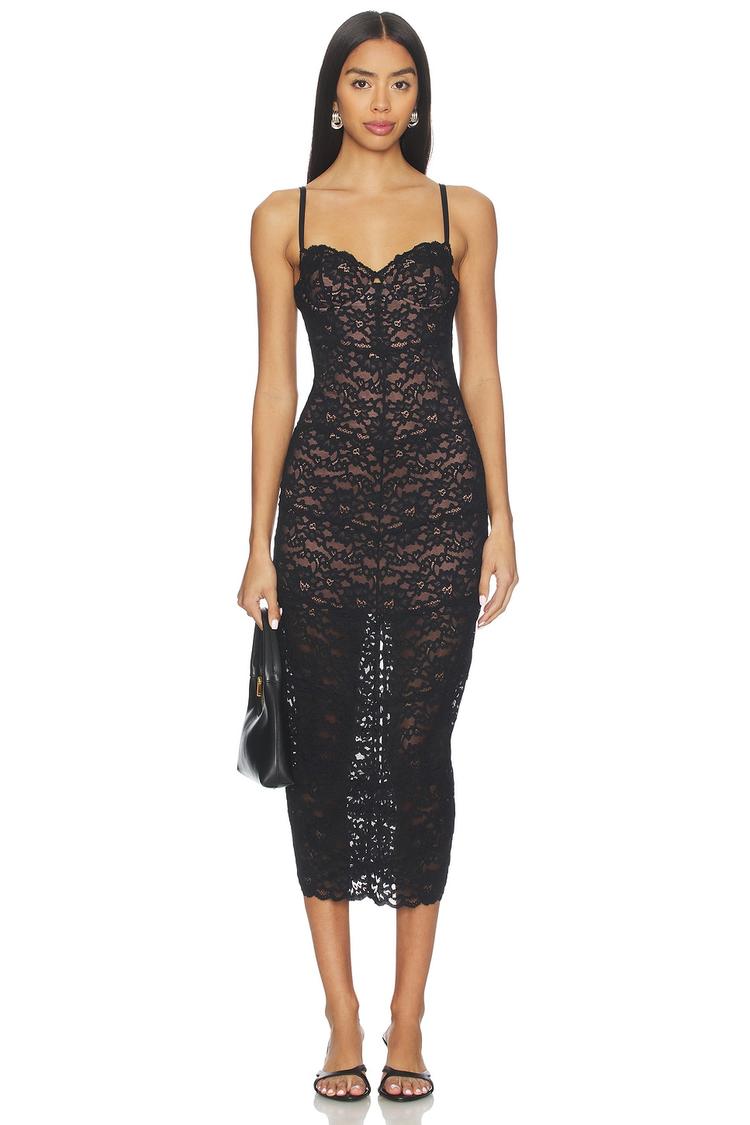 A seductive silhouette crafted in midweight black lace, this corset dress features a sweetheart neckline with delicate spaghetti straps and unpadded underwire cups for a flattering fit. The midi length and concealed back zipper create an elegant, modern look perfect for cocktail parties, date nights, and evening outings. Partially lined to enhance comfort, this bodycon dress embodies timeless sophistication with all-over lace detailing, making it a standout piece for versatile all-weather wear.