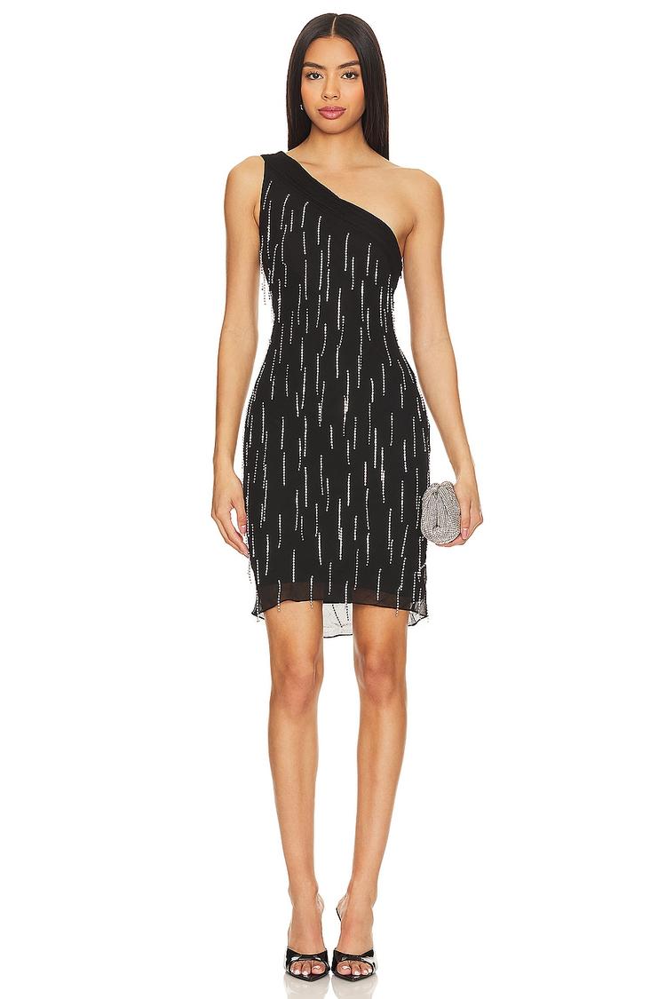 A striking matte black sheath dress features a sleek one-shoulder asymmetric neckline and sleeveless styling for a bold silhouette. The mini length and fitted cut enhance its sexy appeal, while the lightweight polyester mesh fabric is fully lined for comfort. Sparkling silver glass bead fringe embellishments cascade all over, adding elegant shimmer and movement. Concealed side zipper closure ensures a smooth fit. This versatile dress is ideal for cocktail parties, night outs, and date nights, blending sophistication with a contemporary edge.
