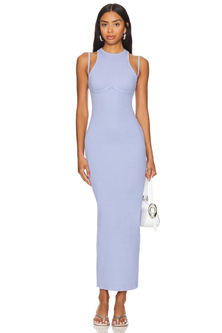 Soft cotton-elastane ribbing sculpts a sleek column silhouette in this strappy maxi dress, featuring a high neck and sleeveless design that accentuates the shoulders. The back is covered with a subtle vent hemline slit for ease of movement, enhancing its refined yet minimalist appeal. Its fitted cut and pull-on styling make it effortless for elegant occasions like cocktail parties, date nights, or night outs. The light blue matte finish adds a fresh and versatile touch, perfect for spring and summer events.