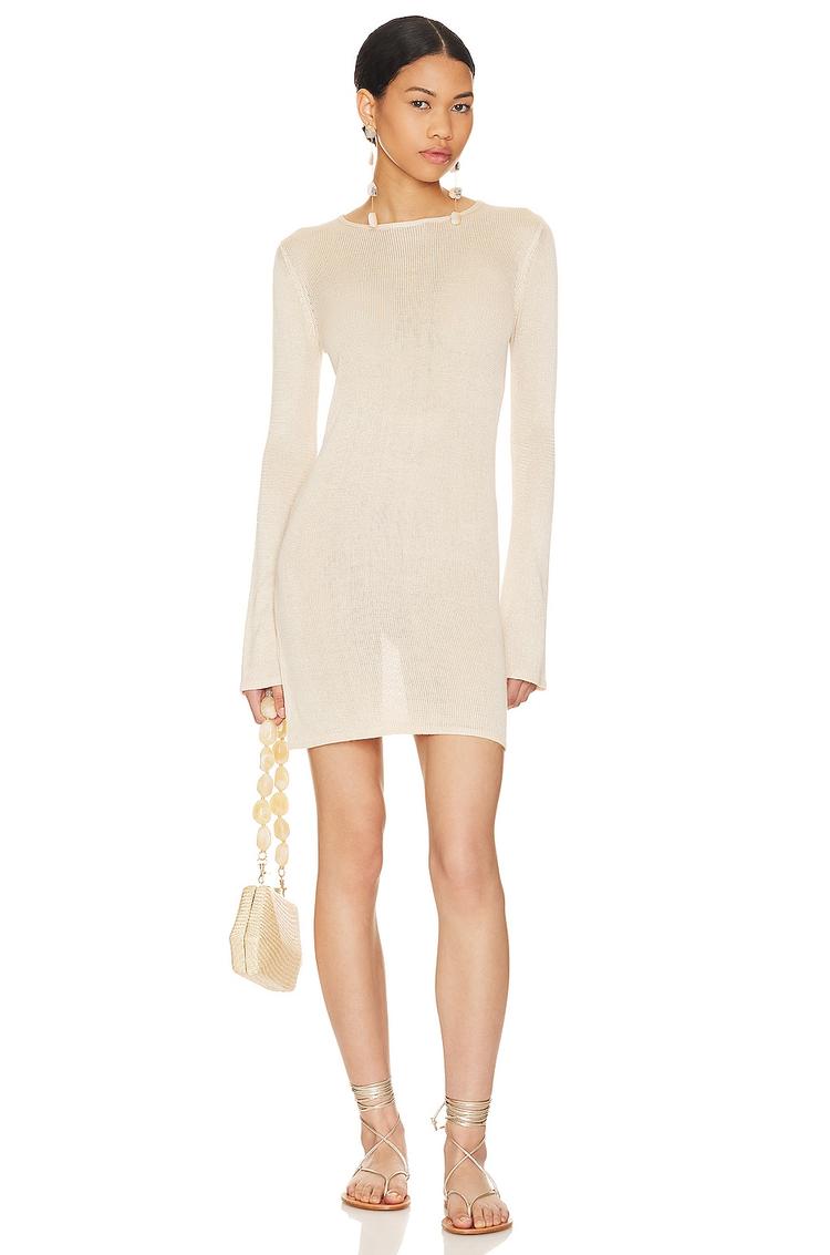 Lightweight rayon knit fabric shapes this beige mini shift dress with a slim fit and long sleeves, perfect for warm spring and summer evenings. The clean hemline and round neckline enhance its minimalist appeal, while the daring open back with a tie closure adds a sexy, modern touch. Its semi-sheer quality lends an alluring vibe, making it a versatile choice for date nights, cocktail parties, or night outs where understated elegance meets subtle sensuality.
