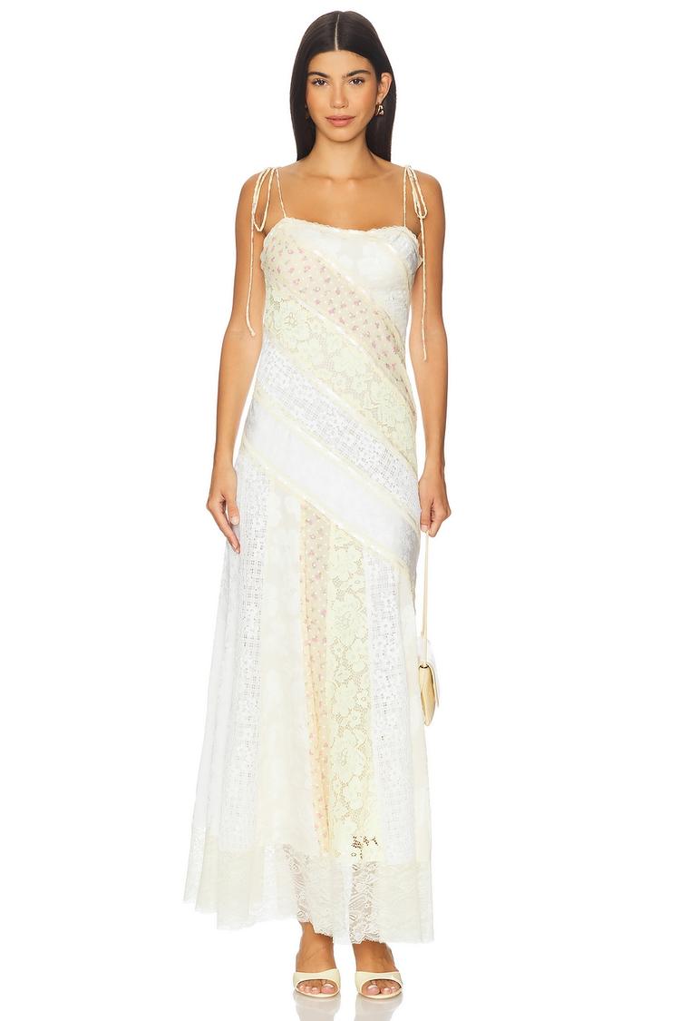 Delicate scalloped lace and embroidered floral detailing enrich this elegant maxi slip dress, crafted from a luxurious blend of silk, polyester, rayon, and spandex. Its fitted silhouette flows gracefully to a ruffled, scalloped hem, complemented by tie-up spaghetti straps and a concealed side zipper for a seamless look. Perfect for spring and summer occasions, this romantic dress suits cocktail parties, formal weddings, and date nights with effortless sophistication and charm.
