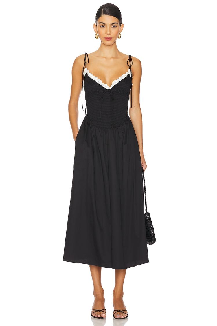 Soft cotton poplin shapes a romantic midi dress featuring a fitted, smocked bodice with delicate off-white lace trim along the sweetheart neckline. Adjustable spaghetti straps tie at the shoulders, adding a subtle feminine detail, while side seam pockets enhance functionality. The flowing A-line skirt falls to a clean hemline, perfect for spring and summer occasions like brunch, date nights, or wedding guest events. This classic, casual chic silhouette blends comfort with timeless style, making it a versatile addition to your warm-weather wardrobe.