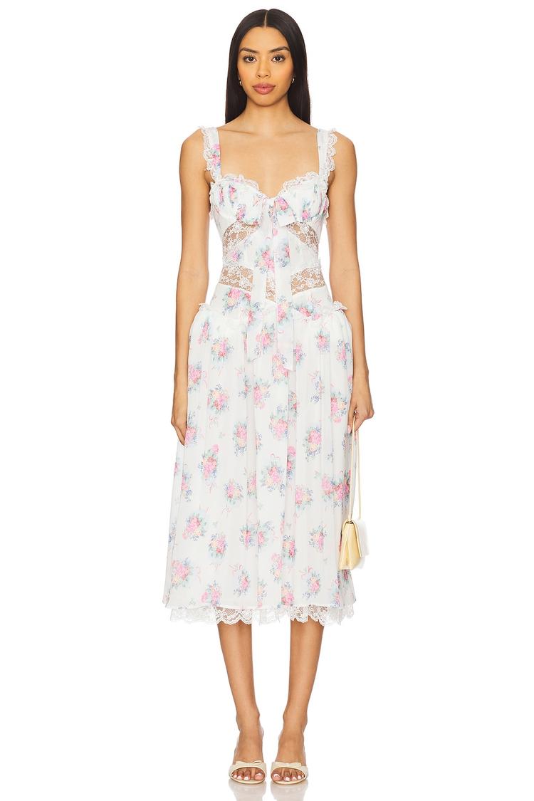 Soft chiffon ruffles and delicate lace paneling define this romantic midi dress, featuring a sweetheart neckline and adjustable spaghetti straps for a fitted, flattering silhouette. The semi-sheer white fabric is adorned with a subtle dusty rose floral print that flows gracefully to a ruffled hemline, perfect for spring and summer occasions. Versatile and elegant, this dress suits brunches, cocktail parties, and wedding guest attire with ease, combining lightweight polyester and lace for a refined, feminine look.