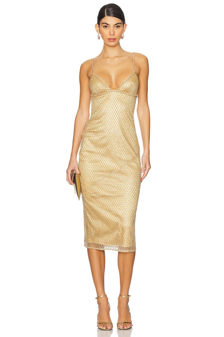A shimmering metallic gold slip dress captivates with its midi length and fitted silhouette, enhanced by delicate rhinestone and sequin detailing all over. The sweetheart neckline and adjustable spaghetti straps offer a flattering and sexy appeal, while the back tie closure adds an alluring touch. Crafted from midweight polyester fabric with a hidden side zipper, this dress is perfect for cocktail evenings, night outs, or romantic date nights, combining modern glamour with effortless style.