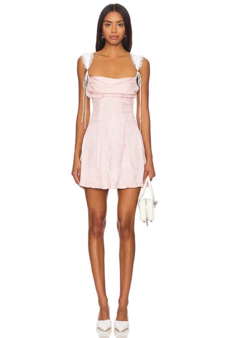 Soft pink satin fabric and a fitted A-line silhouette create a romantic mood in this mini dress. The square neckline and wide lace-trimmed straps with delicate tie details add feminine charm, while the open back with hidden zipper and hook-and-eye closure offers a subtle allure. Perfect for spring and summer occasions such as brunch, date nights, and cocktail parties, this dress features ruffle trim and a lined bust for added comfort and elegance.