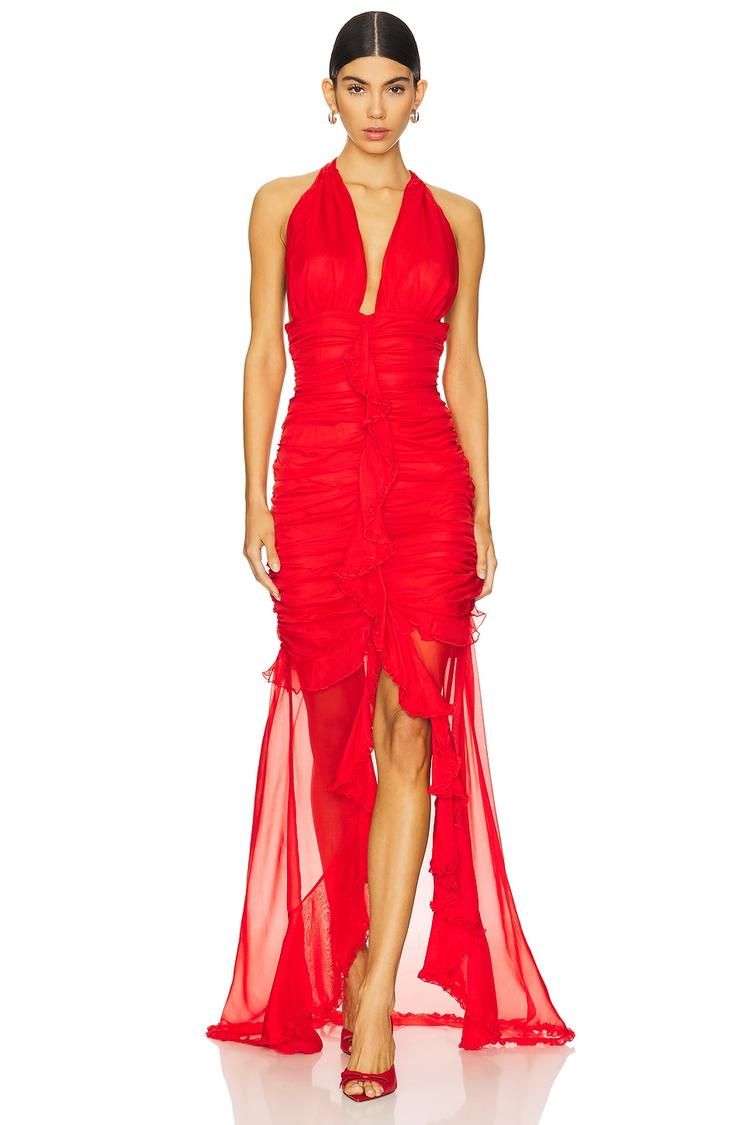 Lightweight chiffon and silk blend fabric shapes this elegant column gown featuring front ruching for a flattering fit. The halter neck with tie closure highlights the neckline while the asymmetric hem and sheer panels create a sensual silhouette. A hidden side zipper ensures a smooth fit. Ideal for formal evenings, cocktail parties, or romantic date nights during spring and summer, this sophisticated red gown exudes confidence and refined glamour.