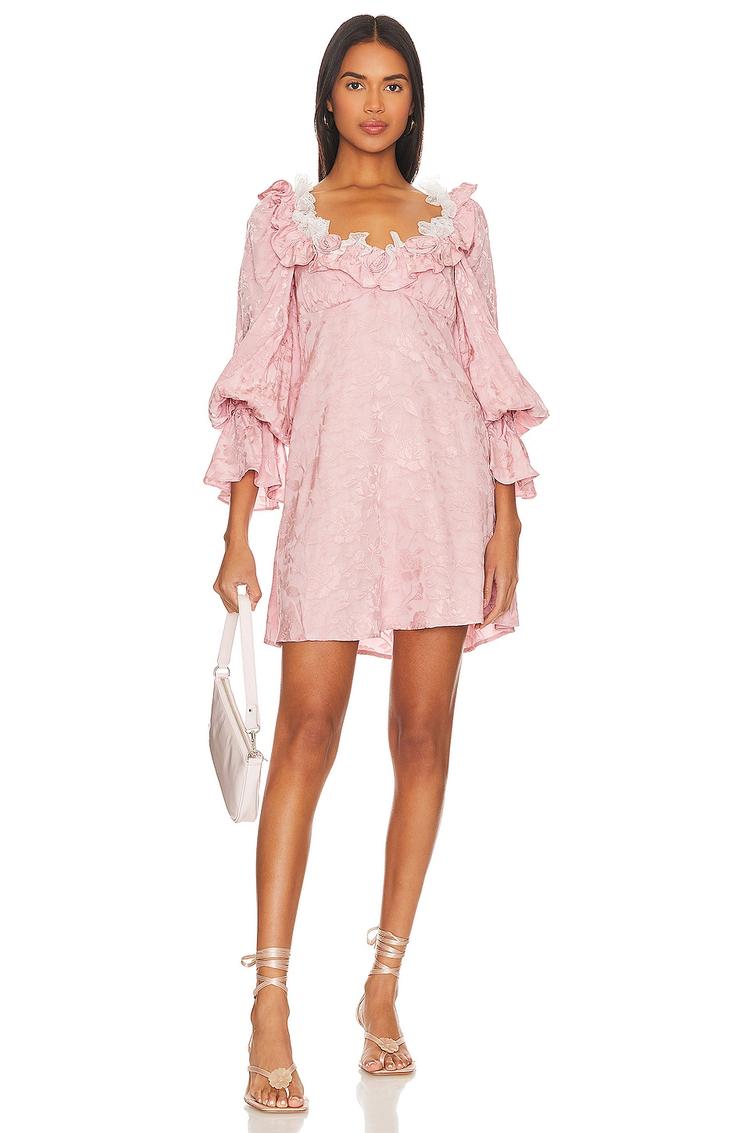 Soft jacquard fabric adorned with rosette appliques and delicate ruffles creates a romantic mini shift silhouette. The dusty pink hue enhances its elegant square neckline and draped blouson sleeves with elastic bell cuffs, adding feminine charm. A back keyhole with a loop button closure completes the look, offering easy pull-on wear. This loose-fitting Rosalia Mini Dress is ideal for spring and summer occasions such as brunch, date nights, or cocktail events, blending comfort and style effortlessly with its intricate design details and airy fabric.