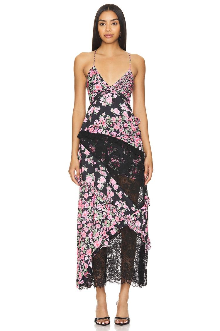 Soft chiffon and lace panels blend seamlessly in this romantic slip dress featuring a slim fit and a flowing maxi length. The delicate floral print in dusty rose and pink contrasts beautifully against the matte black base, while the V-neck and spaghetti straps highlight a feminine silhouette. Ruffled asymmetric hems and lace trims add sophisticated texture and movement. Ideal for spring and summer evenings, this elegant dress suits cocktail parties, formal events, and wedding guest occasions with effortless charm and grace.