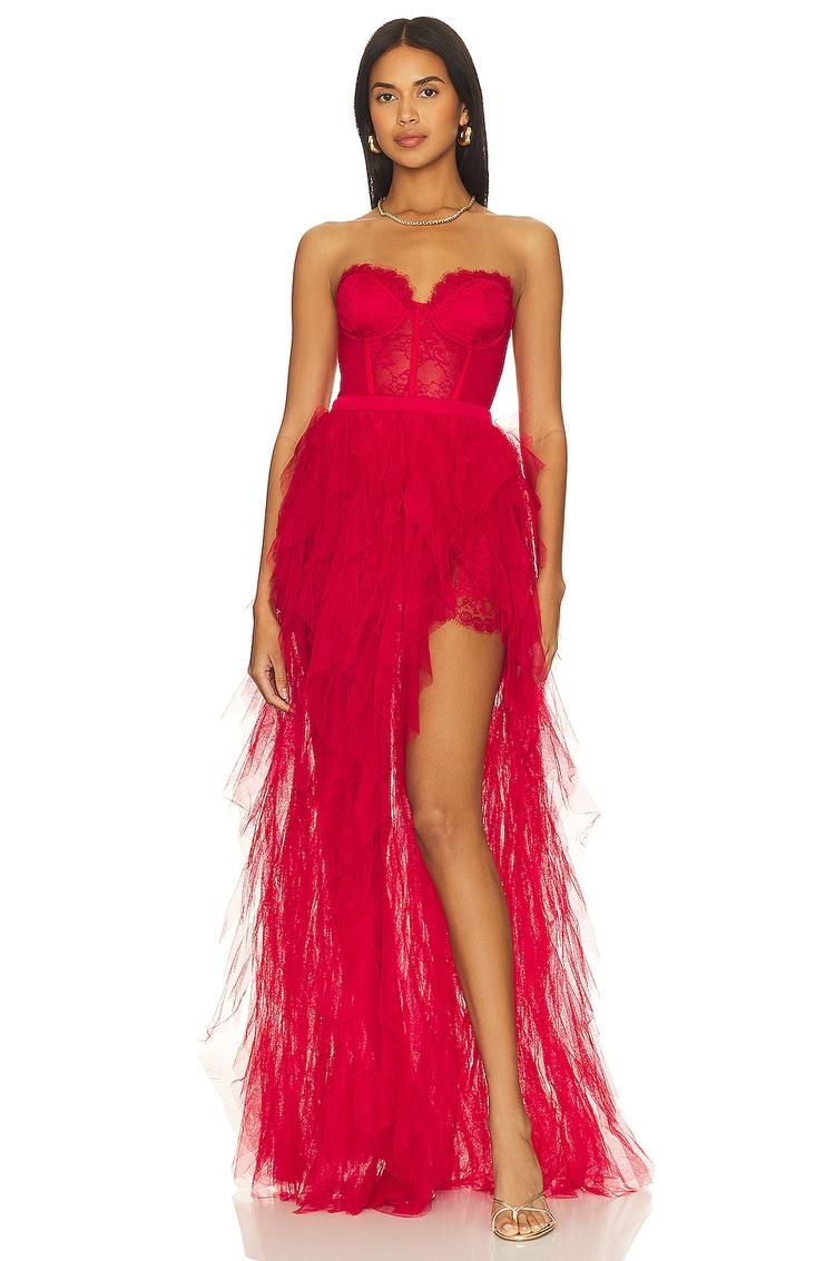 A striking red corset gown features a boned bodice with delicate lace trim, creating an elegant silhouette. The strapless sweetheart neckline and fitted bodice highlight the figure, while the flowing draped tulle skirt with a daring slit adds movement and sophistication. Crafted from polyester, nylon, spandex, and silk blend fabrics, this maxi-length gown is perfect for formal occasions, cocktail parties, and red carpet events. The hidden back zipper and snap button closure ensure a seamless fit, making it a stunning choice for a memorable evening.