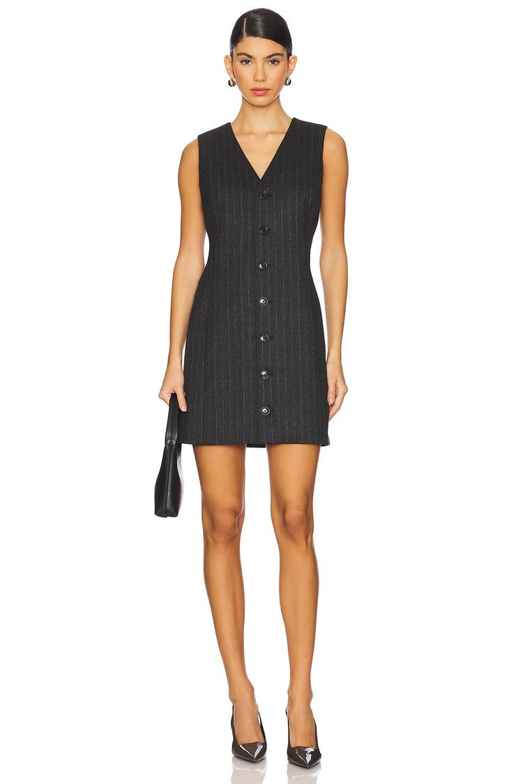Tailored for a sleek, modern look, this pinstripe suiting dress features a fitted sheath silhouette with a sleeveless design and a flattering V-neckline. The matte black crepe fabric with subtle gray pinstripes offers a classic yet contemporary appeal, ideal for workwear, business casual settings, or evening cocktail events. Front button closure enhances its polished finish, while the mini length adds a youthful edge. Fully lined for comfort, this versatile dress balances professional sophistication with minimalist style, making it a perfect choice for date nights and night outs.