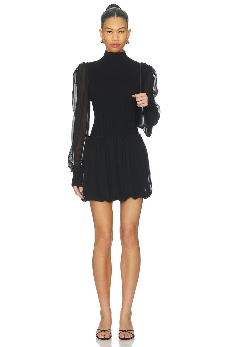 A sleek matte black swing silhouette crafted from lightweight ribbed wool jersey offers a refined yet playful look. The mini length is complemented by a ruffled skirt hem and exaggerated sheer georgette long sleeves, enhancing the dress's elegant sophistication. A cozy turtleneck adds modernity and warmth, making this dress perfect for autumn and winter evenings. Its regular fit flatters a variety of shapes, ideal for cocktail parties, date nights, and night outs. Partial lining ensures comfort while the combination of wool and silk fabrics elevates the tactile experience with subtle texture contrasts.
