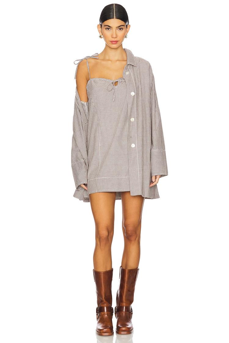 Midweight matte beige poplin fabric shapes a versatile mini shift and shirt dress set with a clean hemline and regular fit. The sleeveless, straight neckline dress features adjustable tie shoulder straps and charming front bow details, complemented by a coordinating oversized shirt dress with front button closure. Ideal for spring and summer, this casual chic ensemble suits brunches, casual outings, and date nights with effortless style and comfort.
