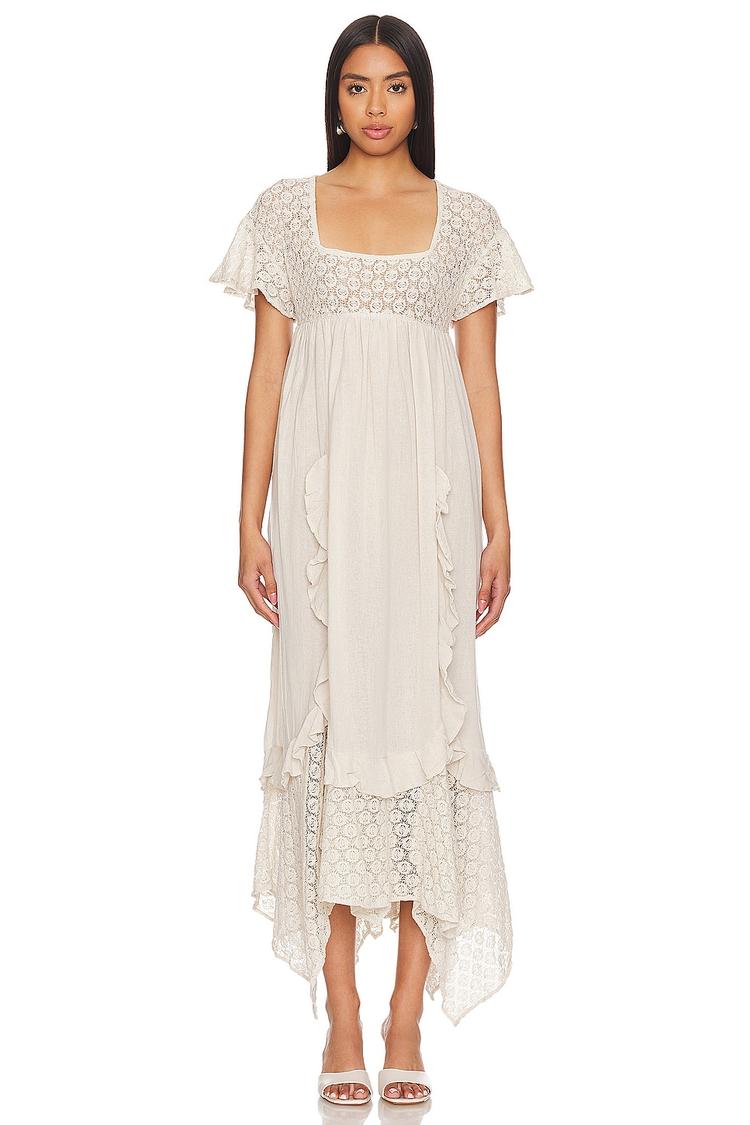Soft cotton and linen blend fabric along with delicate eyelet embroidery and ruffles create a romantic and airy empire waist midi dress. The square neckline and short regular sleeves complement its loose fit, while the asymmetric ruffled hem adds gentle movement. Side seam pockets enhance functionality, making it an easy pull-on style perfect for casual outings, brunches, and vacation days. This breathable dress embodies bohemian charm and casual chic sophistication, ideal for warm spring and summer seasons.