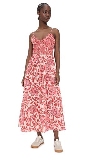 Soft cotton fabric and a relaxed A-Line silhouette highlight this midi dress with an all-over floral pattern in pink and beige tones. The sweetheart neckline and delicate spaghetti straps add a feminine touch, complemented by subtle ruffle details on the front. Its breathable material and flowy fit make it ideal for spring and summer occasions like casual outings, brunch dates, or a vacation getaway. Effortlessly chic and comfortable, this dress embodies a bohemian, casual chic style perfect for warm weather days.