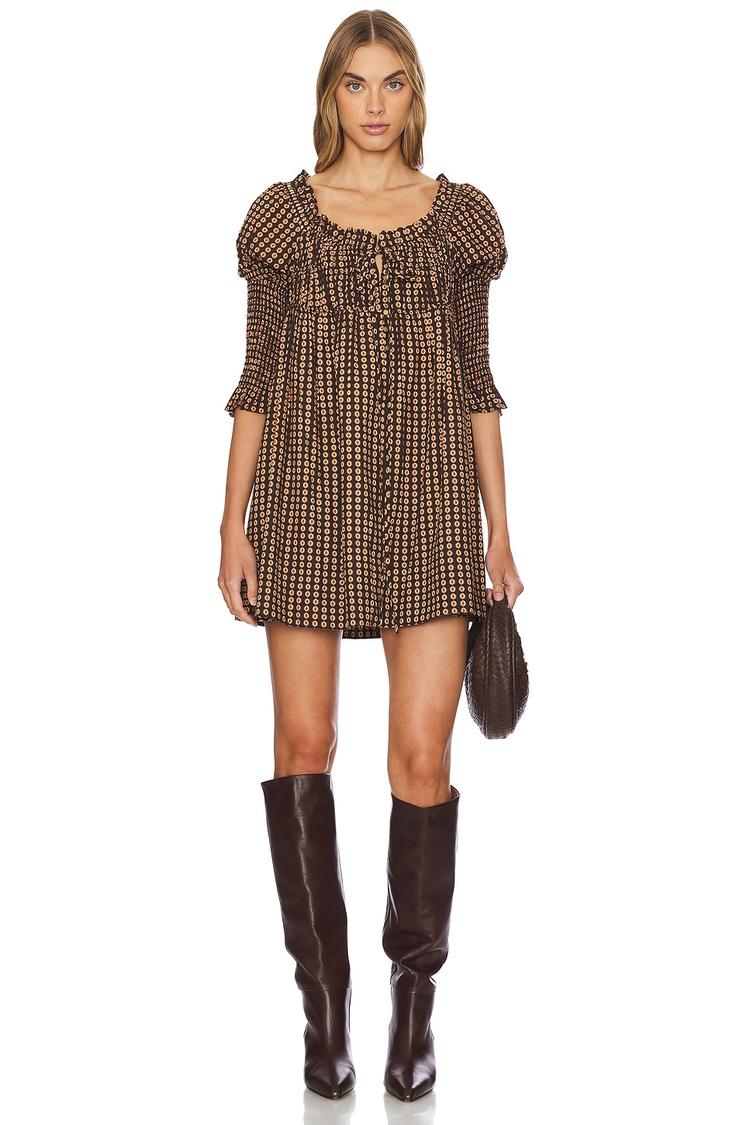 Effortless bohemian charm shines through this babydoll mini dress crafted from soft 100% cotton. Featuring a relaxed fit with puffed elbow sleeves and smocked bodice detailing, the round neckline and tie-back closure add delicate touches. Its all-over checkered print in warm brown and black tones complements the clean hemline and practical side slit pockets. Ideal for casual outings, brunch dates, or laid-back evenings, this breathable dress blends comfort with carefree style across spring, summer, and autumn seasons.
