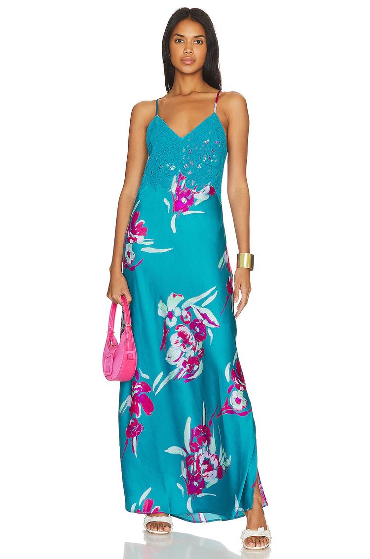 Satin turquoise fabric with a vivid floral print lends a fresh, summery vibe to this maxi slip dress. The slim fit skims the silhouette, enhanced by adjustable spaghetti straps and a delicate lace bodice with embroidered details. Side slits create elegant movement, perfect for warm-weather occasions. Ideal for date nights, brunches, or vacation getaways, this romantic and bohemian-inspired dress blends comfort and style with breathable cotton and rayon lining. Its pull-on slip-on design ensures easy wear while maintaining a polished look.