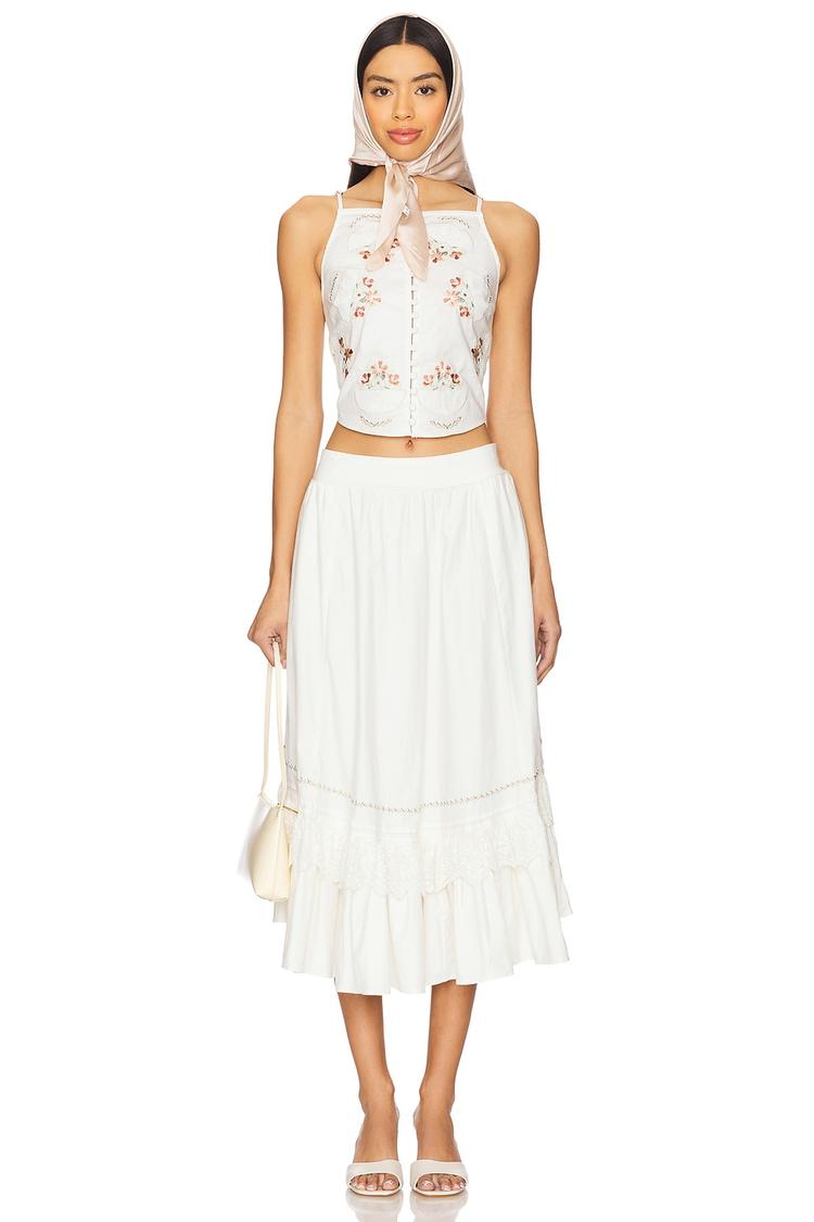 Delicate embroidery and lace trims adorn this white midi set, featuring a halter neck top with front button loops and a side hidden zipper. The A-line skirt with a ruffled hem offers a romantic, bohemian vibe in midweight cotton blend fabric, perfect for spring and summer. Its regular fit and sleeveless styling create an effortlessly chic look ideal for casual outings, brunch dates, or relaxed evenings. Fully lined for comfort, this versatile set combines classic charm with modern detailing for a refreshing seasonal staple.