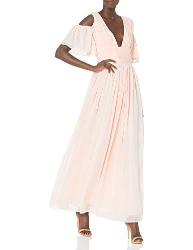 Soft chiffon and a flowing maxi silhouette create an elegant and romantic look with this pink opal maxi dress. Featuring a flattering v-neckline and half-length cold-shoulder sleeves, the banded waistline enhances the flowy fit for graceful movement. The open back adds a subtle allure, while the fully lined fabric ensures comfort. Perfect for spring and summer occasions, this dress suits cocktail parties, formal events, and wedding guests seeking a sophisticated style.