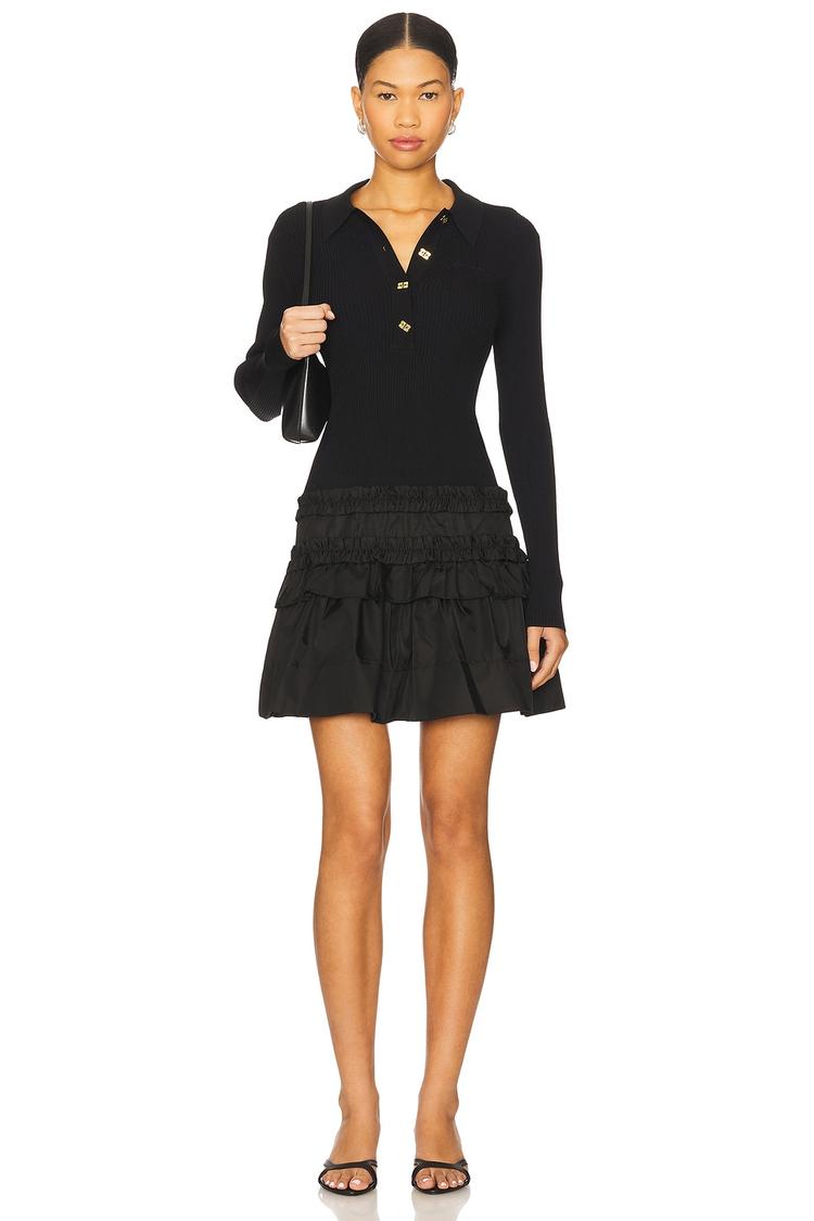A sleek black mini dress featuring a ribbed jersey knit bodice and a layered taffeta skirt with ruffle detailing at the hemline. This shift silhouette offers a slim fit with long sleeves and a chic V-neckline complemented by a partial front gold-tone button closure. Perfect for casual outings, brunch, or date nights, it blends modern minimalism with playful texture contrast. Crafted from a viscose and nylon blend, this dress combines comfort with contemporary style for versatile all-weather wear.