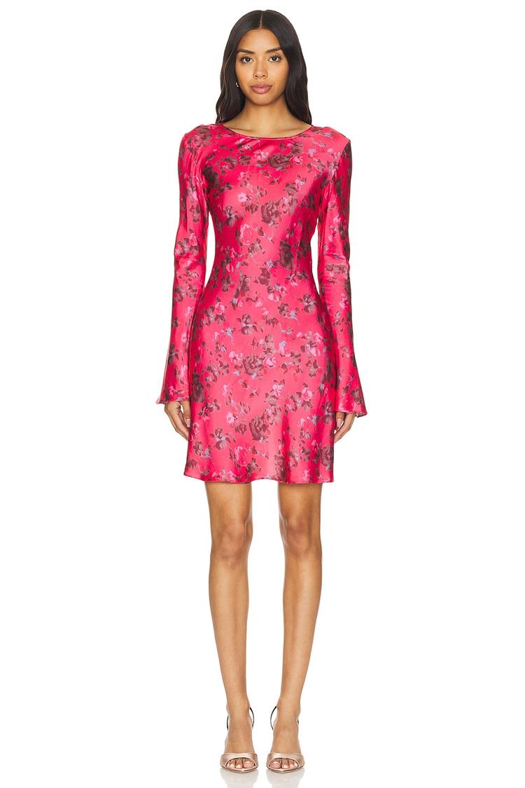Soft satin fabric with a subtle sheen highlights this mini dress's figure-flattering slim fit and classic round neckline. The long sleeves and covered back balance the playful floral print spread all over the vibrant bright pink base, creating a chic, modern silhouette. Its clean hemline and pull-on slip-on styling offer ease and comfort, perfect for casual outings, brunches, or date nights during spring to autumn. This versatile piece blends trendy and elegant elements for a standout look in any setting.
