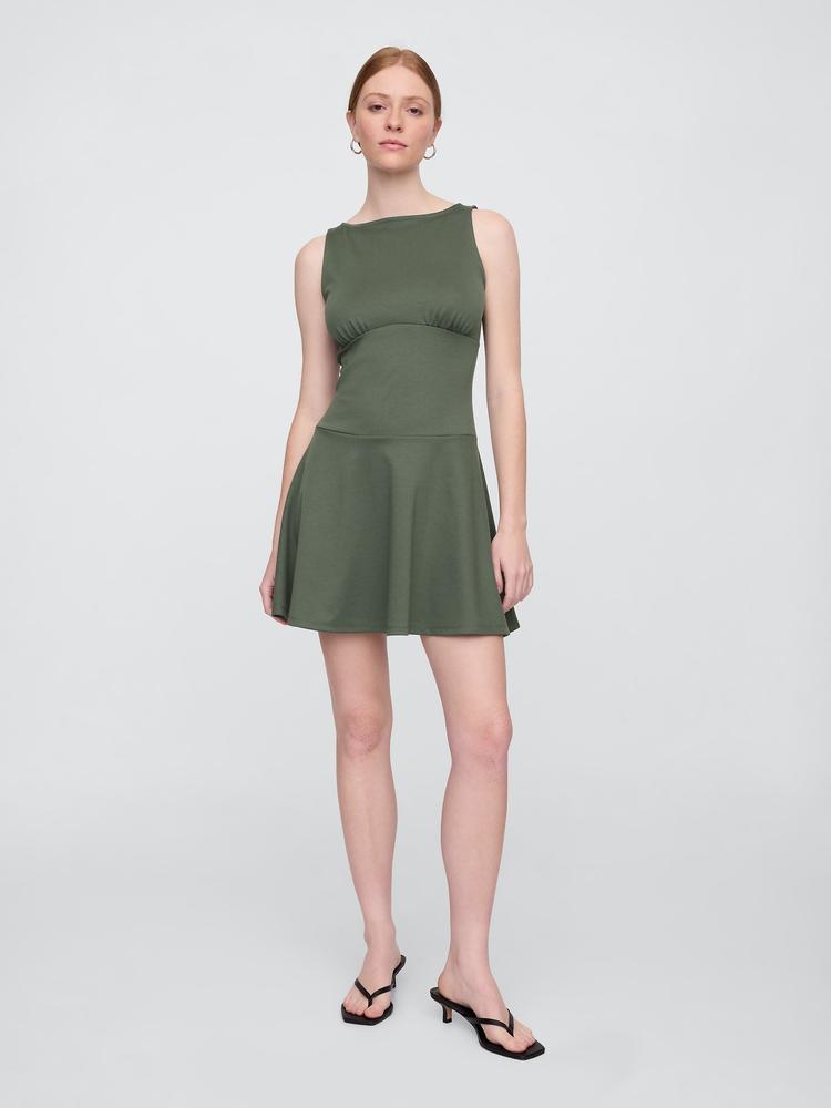 Soft cotton fabric and a fitted silhouette emphasize a sleek, minimalist style in this olive green boatneck mini dress. The clean hemline and sleeveless cut make it ideal for warm weather, combining comfort with casual chic appeal. Its versatile nature suits everyday wear, brunch dates, or casual outings with ease, offering a fresh, effortless look that pairs well with sandals or heels.