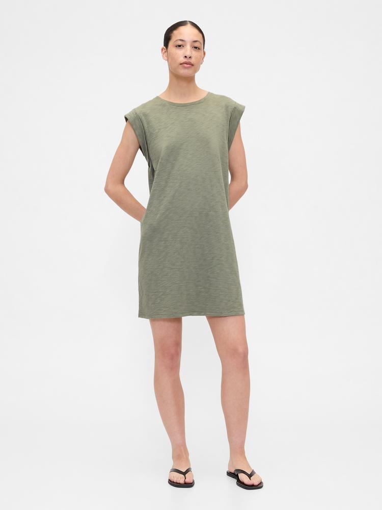 The matte olive hue and clean hemline combine with a classic crew neck and cuffed sleeveless styling for an effortlessly chic mini T-shirt dress. Crafted from breathable cotton, this regular fit piece offers comfort and versatility, perfect for casual outings, everyday wear, or travel adventures. Its minimalist design and slip-on closure make it an easy go-to for warm seasons like spring, summer, and early autumn, blending laid-back style with practical comfort.