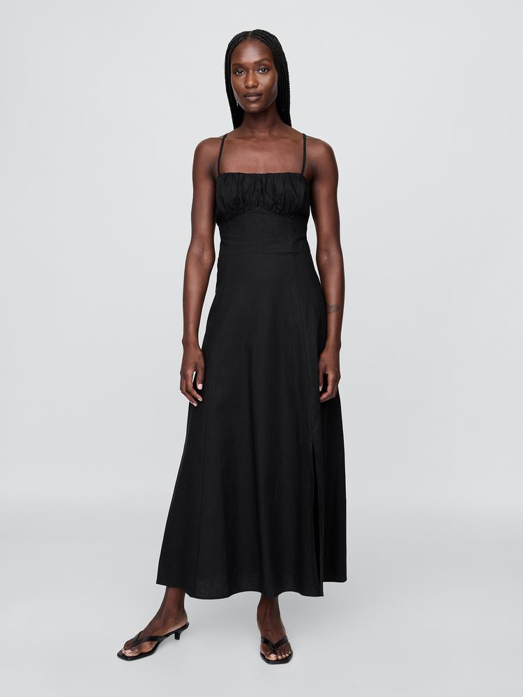Soft linen-cotton blend fabric and a fitted column silhouette highlight the elegant simplicity of this maxi dress. Featuring a square neckline and slender spaghetti straps that cross at the back, the shirred bodice adds texture and shape, complemented by a tasteful side slit for ease of movement. Its matte black hue and clean hemline create a versatile piece perfect for casual days, brunch outings, or relaxed date nights during warmer seasons. The minimalist design paired with smocked detailing offers a chic, understated look for effortless style.