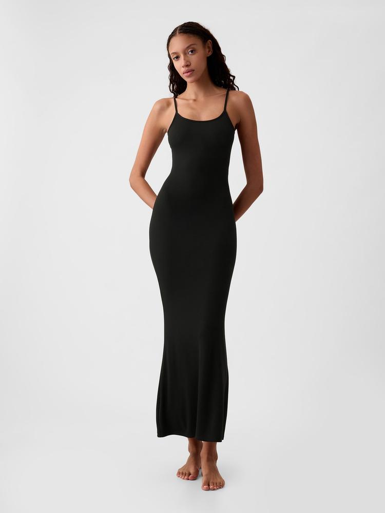 Soft modal fabric and a slim silhouette define this matte black maxi slip dress, featuring delicate spaghetti straps and a simple U-neckline. The clean hemline complements its minimalist style, making it a versatile piece perfect for casual days, loungewear, or sleepwear. Its covered back and sleeveless design offer comfort and ease for all-weather wear. Whether relaxing at home or running errands, this dress blends comfort with understated elegance effortlessly.