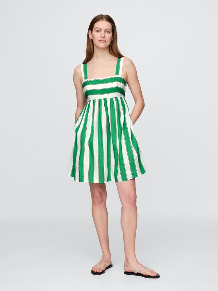 Bright green and white vertical stripes enhance the casual chic vibe of this cotton poplin mini dress. The square neckline and wide straps provide a flattering frame, while the tie-back with a bow detail adds a playful touch to the covered back design. Its regular fit and clean hemline create a comfortable and effortless silhouette perfect for spring and summer outings. Ideal for casual days, brunch with friends, or vacation getaways, this dress combines breathable cotton fabric with stylish stripes for easy everyday wear.