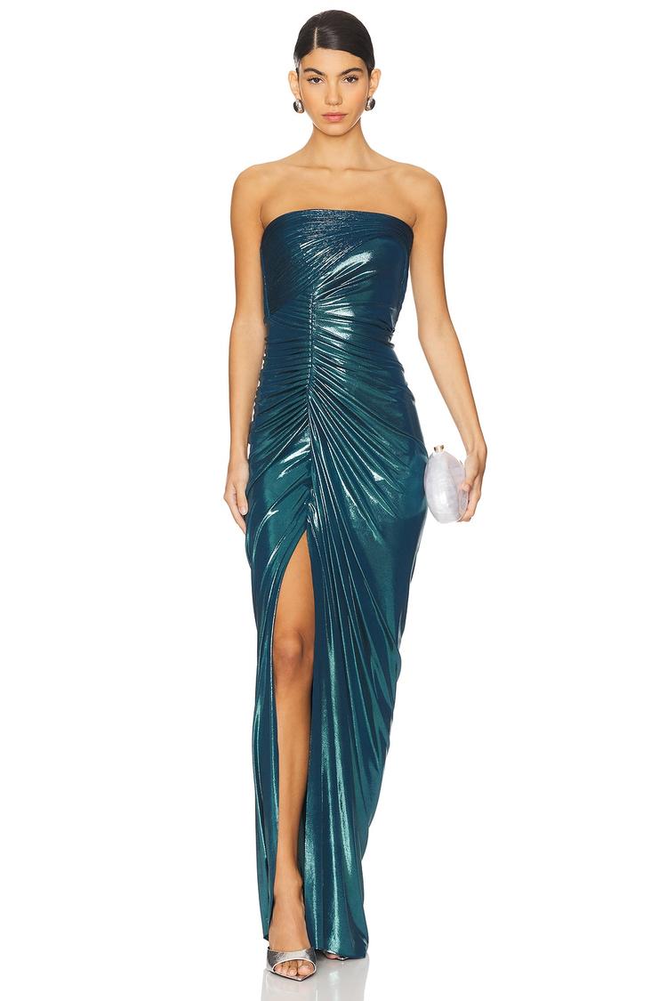 Shimmering dark teal lame fabric sculpts a sleek column silhouette with a strapless straight neckline, creating an elegant and modern gown. The fitted design features intricate draping across the front that enhances the figure, complemented by a daring side slit and a clean maxi hem. Fully lined with a hidden back zipper closure, this sophisticated piece is perfect for formal events, cocktail parties, and gala evenings, offering both style and comfort with its polyester-elastane blend.