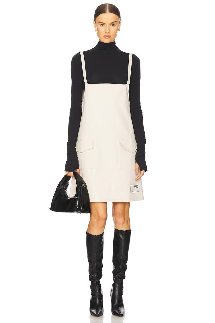 Clean lines and a minimalist silhouette define this off-white pinafore dress crafted from a midweight cotton jersey fabric. Featuring a straight neckline and sleeveless styling, the dress is designed with a pull-on elastic waistband for ease and comfort. Practical side flap pockets add a subtle functional detail, while its above-knee length makes it perfect for casual streetwear or everyday spring and autumn wear. Layer it over a long-sleeve top for versatile styling from brunch to relaxed weekend outings.