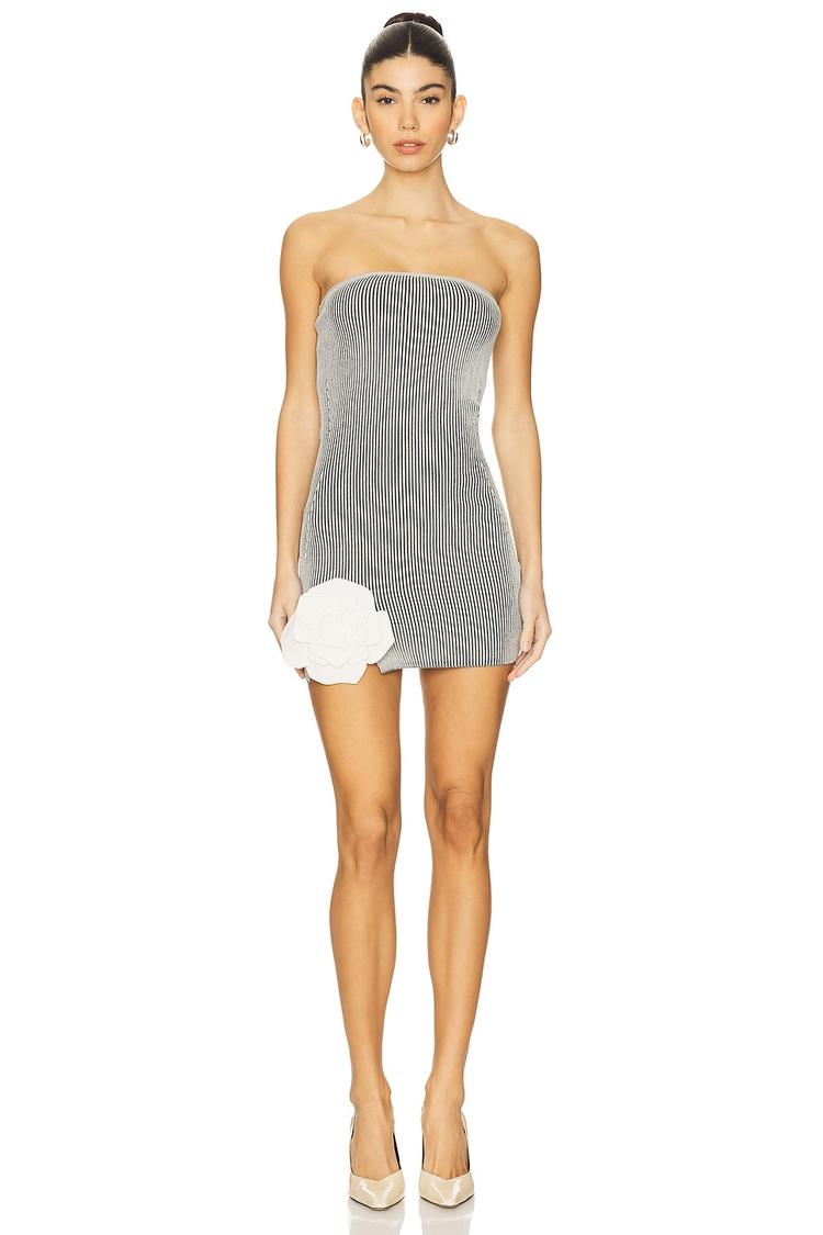 A sleek ribbed knit fabric sculpts a tight, strapless silhouette that ends in a clean mini hem, perfect for warmer seasons. The modern straight neckline and detachable white floral pin add a subtle, chic detail to this minimalist bodycon dress. Crafted from a blend of viscose and polyamide, it offers lightweight comfort ideal for cocktail parties, night outs, or romantic date nights. Its pull-on style ensures effortless wear, making it a versatile staple for stylish, confident evenings.