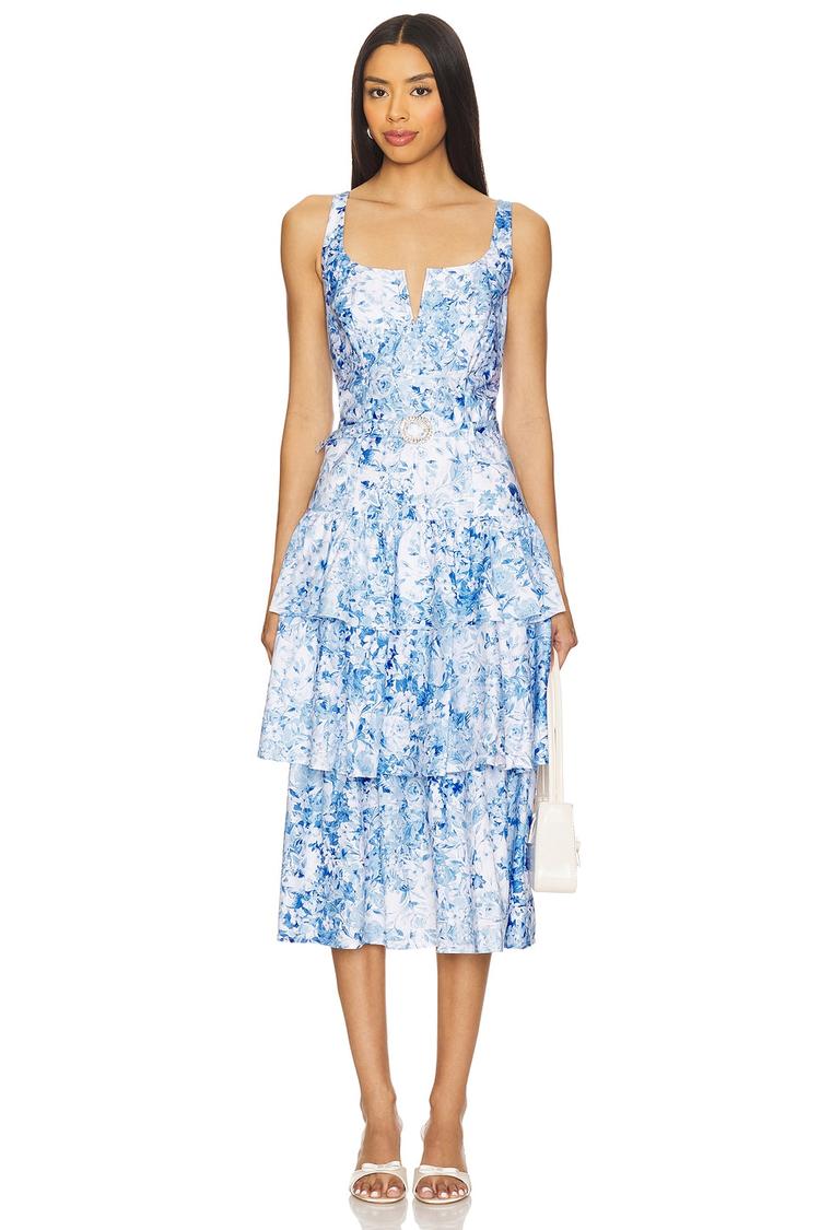 Soft ruffled layers and a delicate floral print define this romantic midi dress crafted from midweight cotton poplin with a touch of elastane for comfort. The fitted silhouette features wide straps and a flattering U-neckline, enhanced by a detachable tonal waist belt with a rhinestone buckle. Perfectly suited for spring and summer occasions like brunch, date nights, or cocktail events, this dress balances classic charm with modern details for versatile, stylish wear.