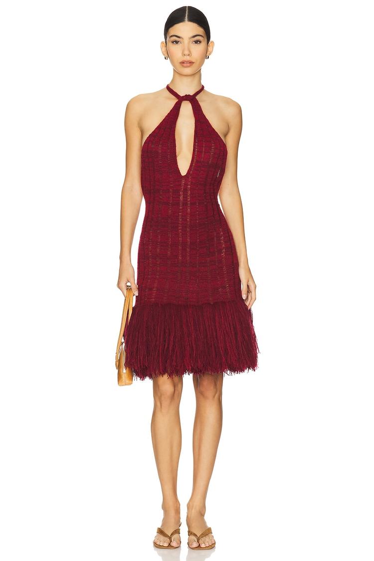 A figure-flattering sheath silhouette meets midweight knit fabric in this alluring mini dress. The halter neck with self-tie closure frames the neckline and shoulders, while the open back adds a bold, sexy touch. Finished with laddered fringe trim along the ruffled hem, this burgundy dress combines texture and movement effortlessly. Ideal for cocktail evenings, date nights, or night out events, it blends modern elegance and cozy warmth with its acrylic, mohair, nylon, polyester, and wool blend.