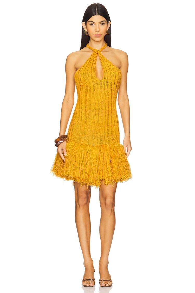 Sun-kissed and playful, this yellow knit mini dress features a fitted sheath silhouette with a flattering halter neck and a daring open back tied at the neck. The front keyhole accent adds a subtle allure, while the ruffled fringe hemline infuses movement and texture. Crafted from midweight cotton knit fabric, it ensures comfort and breathability for warm spring and summer evenings. Ideal for date nights, cocktail parties, or a night out, this trendy and sexy dress elevates your wardrobe with its vibrant hue and eye-catching design details.