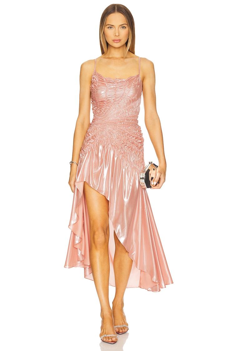 Soft metallic satin fabric and a fitted slip silhouette with smocked elastic bodice deliver an elegant look perfect for cocktail parties and date nights. The high-low hem with ruffled detailing adds movement and modern allure, while adjustable spaghetti straps ensure a comfortable, customized fit. This dusty rose shimmer dress transitions seamlessly from spring brunches to summer evening events, embodying sophisticated style and feminine charm with every wear.